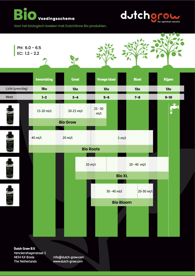 Verwenden Sie DutchGrow Bio Grow für die Wachstumsphase, zur Förderung von kräftigen Pflanzen und üppiger Wurzelentwicklung mit biologisch gebundenem Stickstoff. DutchGrow Roots stärkt die Wurzeln und die Widerstandsfähigkeit der Pflanze. DutchGrow Bio XL, ein natürlich fermentierter Pflanzenextrakt, fördert die Blühphase und erhöht den Fruchtzuckergehalt. DutchGrow Bio Bloom unterstützt die Fruchtbildung während der Blühphase, mit weniger Stickstoff und mehr Phosphor und Kalium.