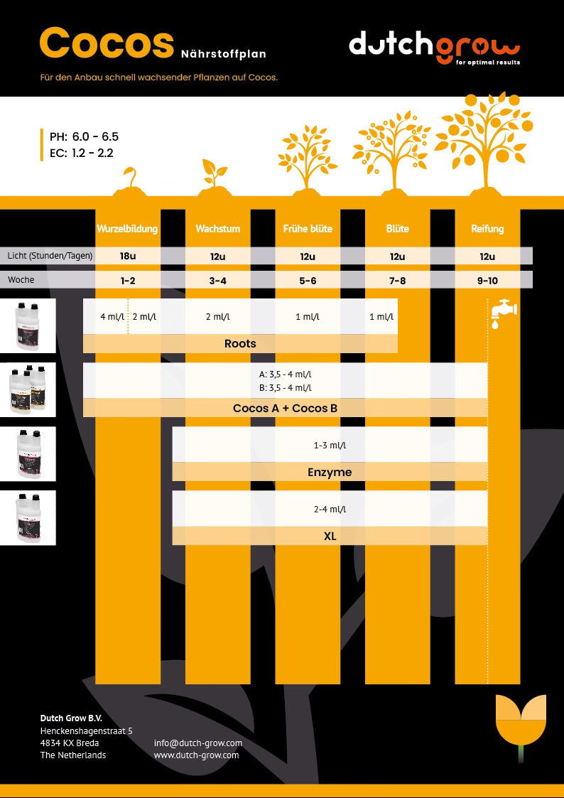 Für ein effektives Wachstum und Blüte von Pflanzen auf Kokossubstrat empfehlen wir ein spezifisches Nährstoffregime mit DutchGrow-Produkten. Während der Einwurzelungs- und Wachstumsphase bei 18 Stunden Licht pro Tag verwenden Sie DutchGrow Roots für die Wurzelentwicklung und Cocos A+B als Grundnahrung. Fügen Sie Enzyme hinzu, um abgestorbene Pflanzenreste abzubauen und den Boden zu verbessern. Bei der Umstellung auf 12 Stunden Licht pro Tag in der Blühphase verwenden Sie weiterhin Cocos A+B und führen Sie XL ein, um die Fruchtentwicklung zu stimulieren, was zu einer besseren Ausbeute und Qualität der Früchte führt.