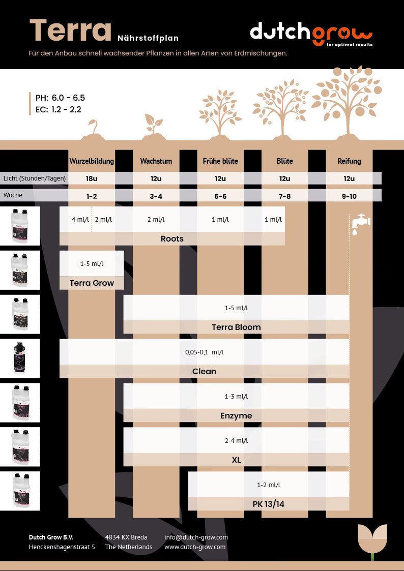 Optimalisieren Sie das Pflanzenwachstum mit diesem DutchGrow Terra Ernährungsschema. Verwenden Sie DutchGrow Roots für eine kräftige Wurzelentwicklung und bessere Pflanzenresistenz. DutchGrow Terra Dünger, speziell für schnell wachsende Pflanzen, fördert sowohl das Wachstum als auch die Blüte. Halten Sie Bewässerungssysteme sauber und effizient mit DutchGrow Clean. Verbessern Sie die Bodenqualität und -struktur mit DutchGrow Enzyme und maximieren Sie die Blüte- und Fruchtqualität mit DutchGrow XL und PK13/14. Diese Kombination gewährleistet ein gesundes Wachstum und üppige Blüte der Pflanzen.