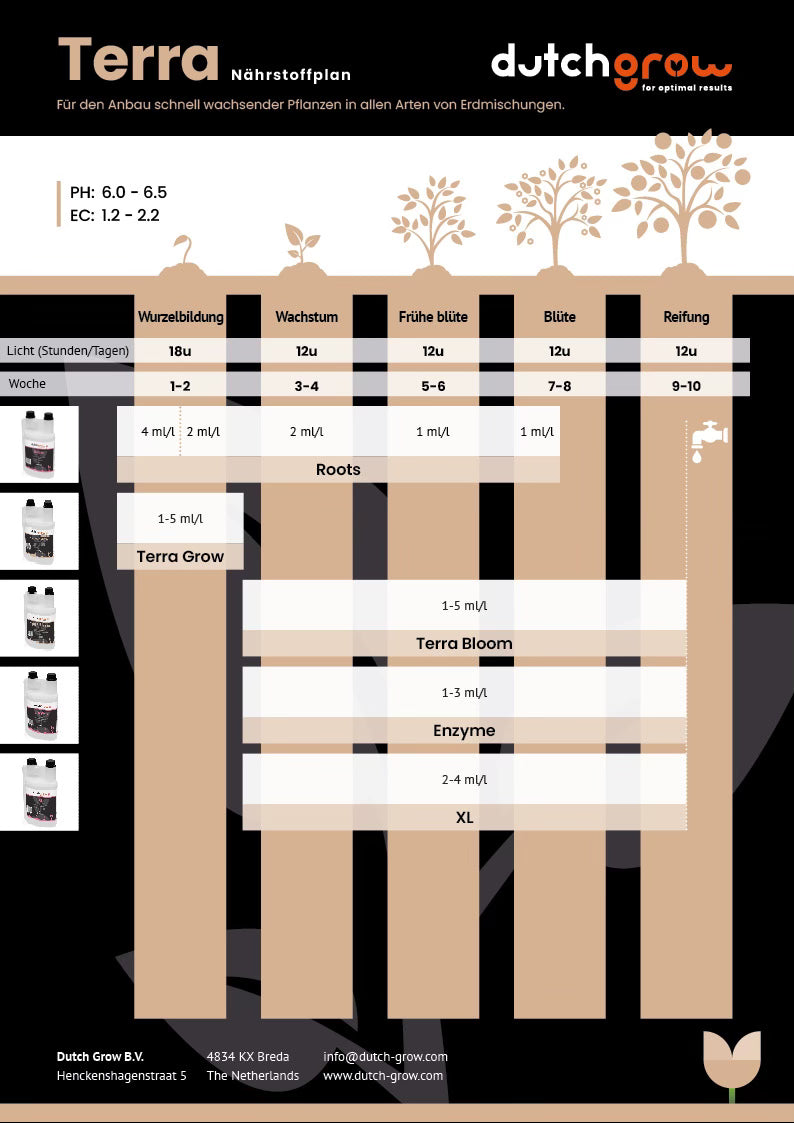 "Für den Anbau schnell wachsender Pflanzen in allen Arten von Erdmischungen wurde das Terra-Nährstoffschema von DutchGrow optimiert. Beginnen Sie in der Einwurzelungsphase mit DutchGrow Roots, um das Wurzelwachstum zu fördern. Wechseln Sie während der Wachstumsphase zu Terra Grow und verwenden Sie während der Blütephase Terra Bloom für optimale Blüte und Fruchtentwicklung. Fügen Sie Enzyme hinzu, um abgestorbene Pflanzenreste abzubauen und das Medium zu verbessern. Beenden Sie mit DutchGrow XL während der Reifephase, um den Ertrag und die Qualität der blühenden Pflanzen zu erhöhen.